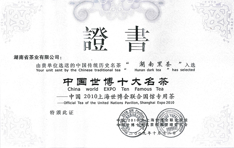 上海世博会中国世博十大名茶证书